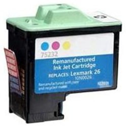 Lexmark #26 Remanufactured Color Ink Cartridge (10N0026) Compatible Printers / Lexmark i3 / Lexmark X1100 / Lexmark X1130 / Lexmark X1140 / Lexmark X1150 / Lexmark X1155 / Lexmark X1180 / Lexmark X1185 / Lexmark X1195 / Lexmark X1240 / Lexmark X1290 / Lexmark X2250 / Lexmark X74 PrinTrio / Lexmark Z13 / Lexmark Z23 / Lexmark Z23e / Lexmark Z24 / Lexmark Z25 / Lexmark Z25L / Lexmark Z33 / Lexmark Z34 / Lexmark Z35 / Lexmark Z515 / Lexmark Z517 / Lexmark Z600 / Lexmark Z601 / Lexmark Z603 / Lexmark Z605 / Lexmark Z615